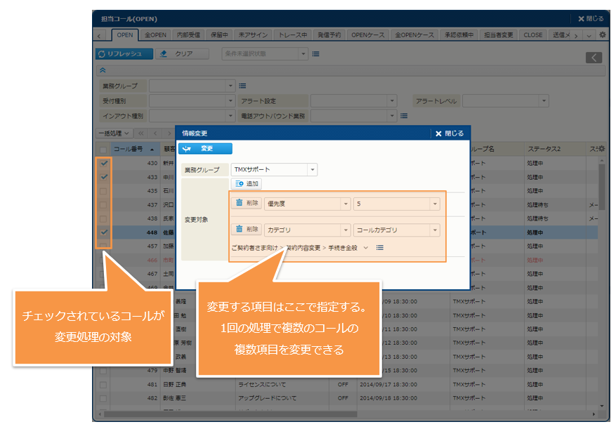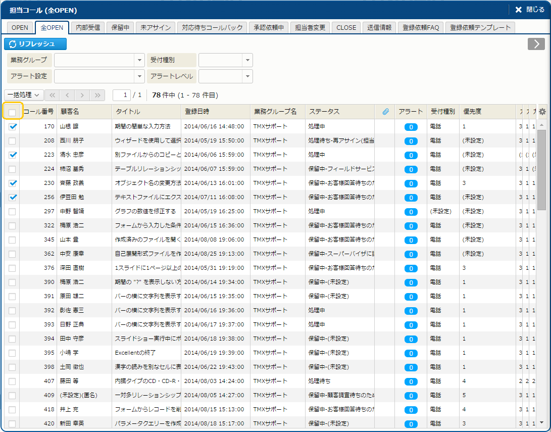 - [コール番号] [顧客番号] などの番号を検索対象とする項目や、[登録日時] [更新日時] などの日付を対象とする項目では、あいまい検索は利用できません。
