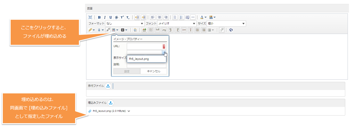 | アップロード | ファイルのアップロードダイアログを開く | |