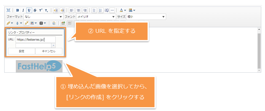 - [リンク・プロパティ] サブウィンドウで、リンク先の URL を指定し、[設定] をクリックします。
