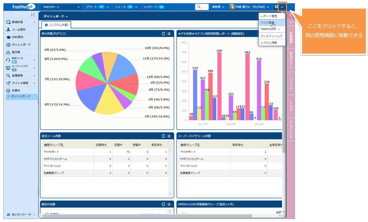 各管理画面の右上のグローバルナビゲーションから、他の管理画面に移動することができます。次に、[コール管理] から [マスタ管理] に移動しようとしているイメージを載せます。