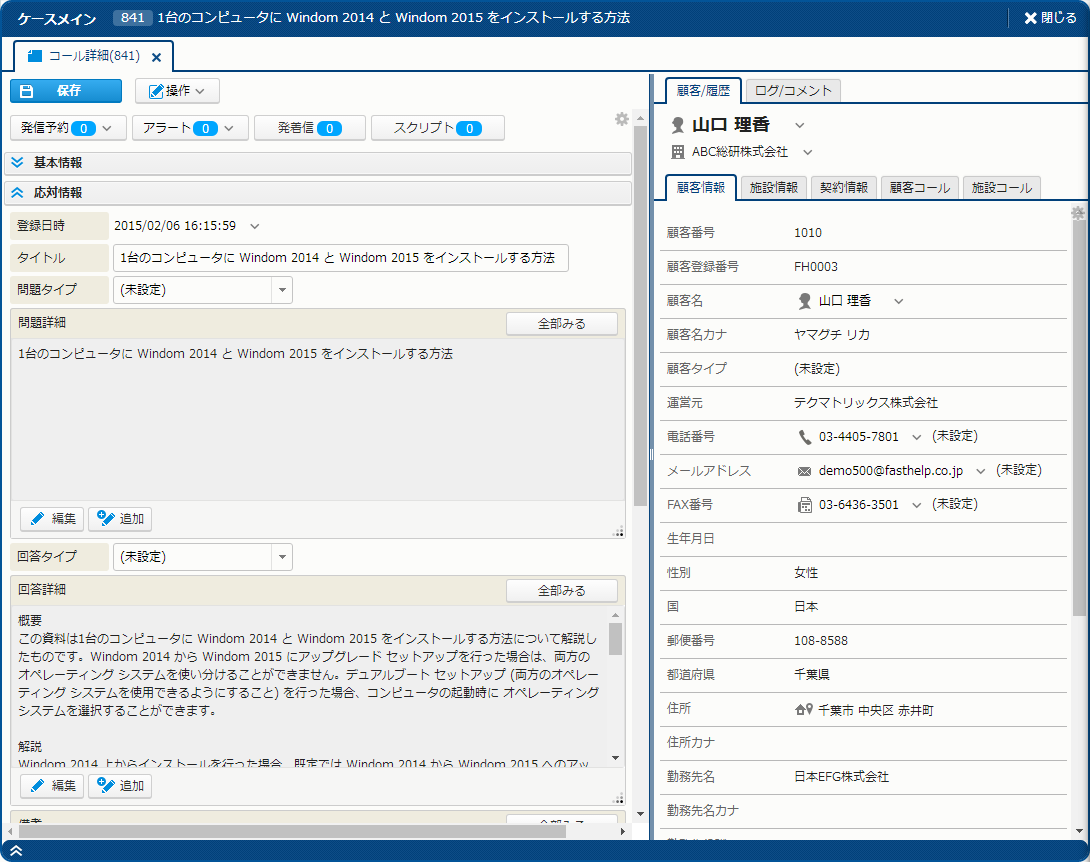 | コールの顧客で契約新規作成 | 契約を新規作成する。作成した契約は、現在のコールの顧客と紐付けられる (顧客の "顧客契約" となる)。 ただし、顧客が "(未設定)" の場合は、契約は作成されるが、顧客とは紐付かない。 |