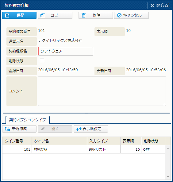 | 開く | 契約オプションタイプを新規作成する。 | 運営元新規権限、運営元更新権限 |
