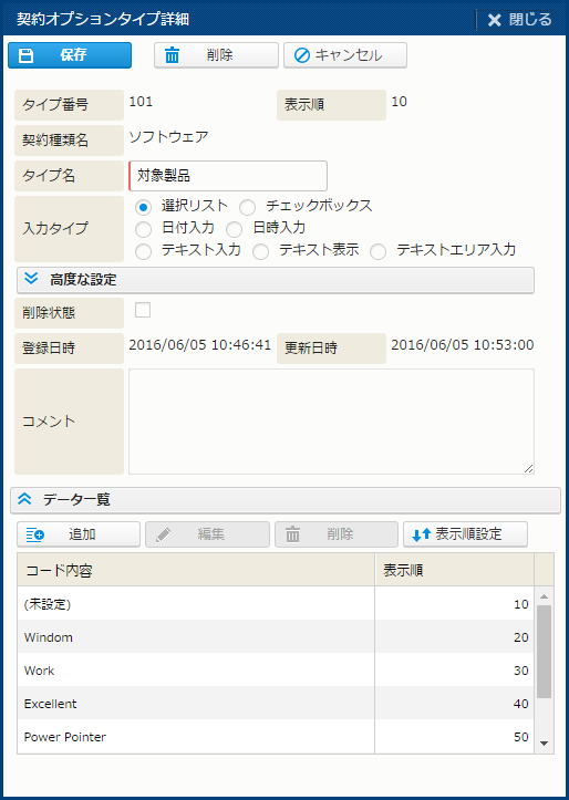 | 表示順 | コードの表示順。("選択リスト" の場合) | |||