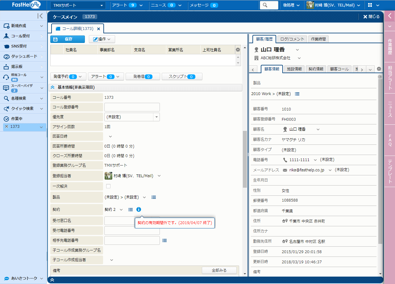 - "有効期間外"、"有効期限が近い" 契約を指定すると、契約の横に "警告" が表示されます。指定時だけではなく、コールに以前記録された契約に関しても、現在日時をもとにコールに警告が表示されます。