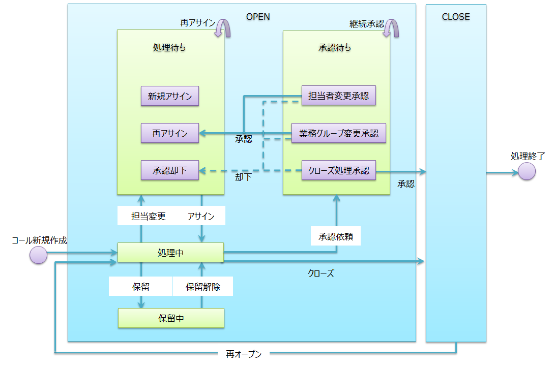| 処理中 | - | コールを画面から新規作成した場合。 アサイン待ち、処理待ち、保留中、CLOSE状態から処理を開始した場合など |