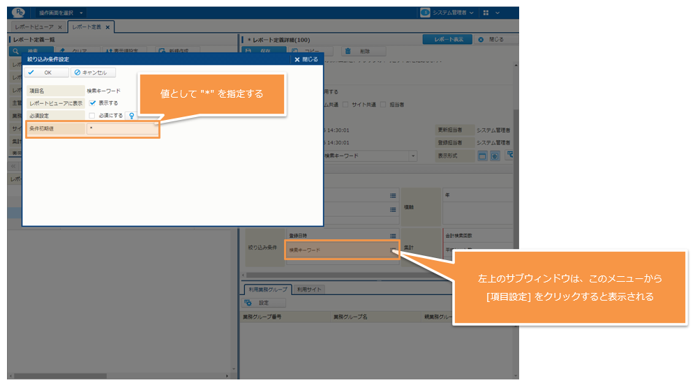 実際に検索キーワードを指定した場合のみを集計対象としたい場合は、レポート定義時に [キーワード] 絞り込み条件を指定し、[条件初期値] として "*" を指定してください。