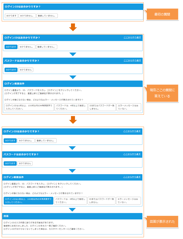 ウィザード形式のナレッジも作成可能です。ウィザード形式では、顧客は、関連する複数の質問に回答することで、目的の情報に自然に辿りつくことができます。