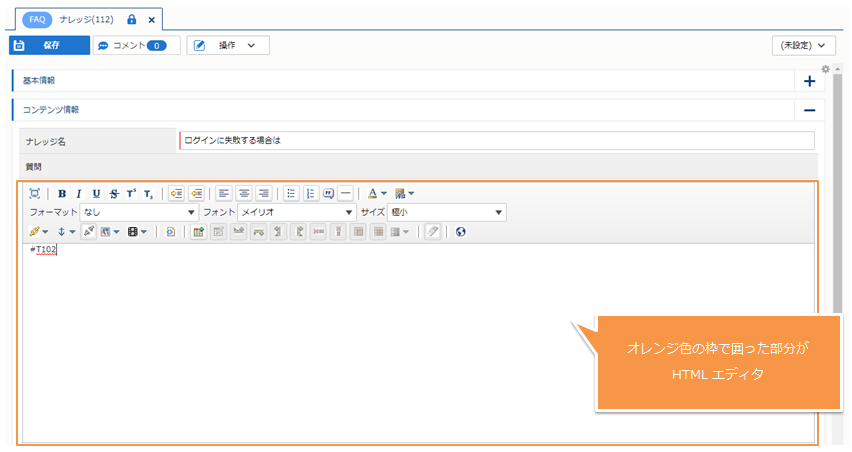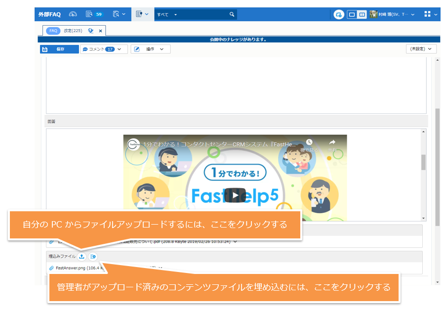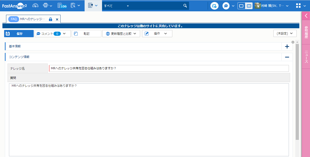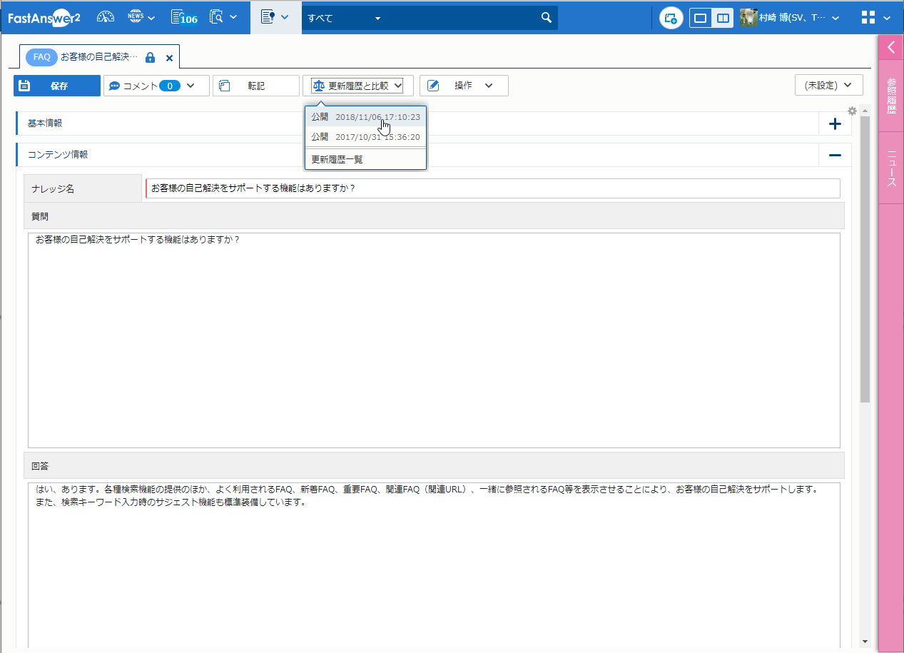 [ナレッジ編集] 画面では、ナレッジの作成、公開、コメントの追加ができます。また、ナレッジの履歴 (いつ誰がどの項目をどのように更新したのか) を使って、履歴の比較、履歴を使った以前の内容の復元ができます。