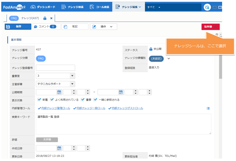 ナレッジを公開するには、[ナレッジ編集] タブ - [操作] - [公開] をクリックします。
