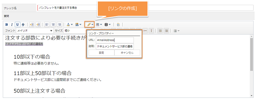 - ナレッジ作成設定は、ナレッジの初期値を管理者が事前に設定する機能です。ナレッジを登録する担当者は、初期値とは異なる情報のみを入力すればよいことになるため、入力の手間を軽減することができます。