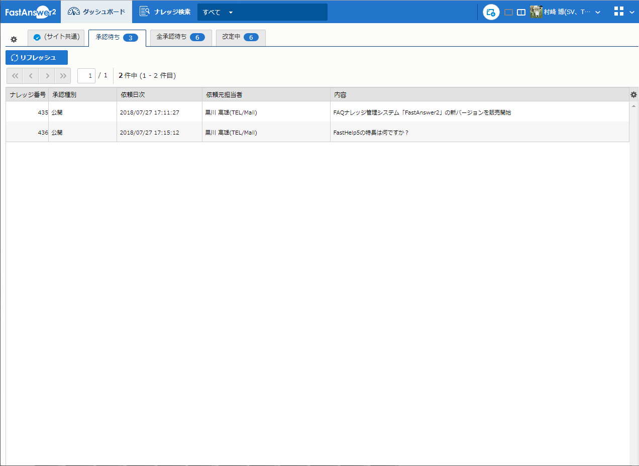 - 承認依頼されたナレッジは、依頼先担当者の [ダッシュボード] - [承認待ち] タブに表示されます。
