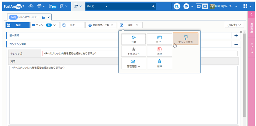 ナレッジは、[ナレッジ編集] 画面の [操作] メニューで [ナレッジ共有] をクリックすることで共有できます。