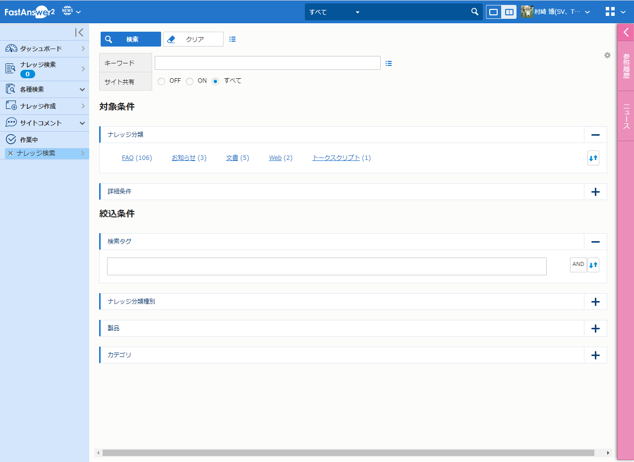 キーワードを条件としてナレッジを検索します。もっとも基本的な検索方法です。