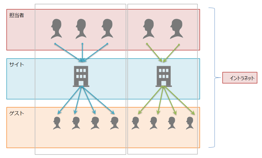 - 担当者もゲストもイントラネット内からサイトにアクセスしている点に注目してください。