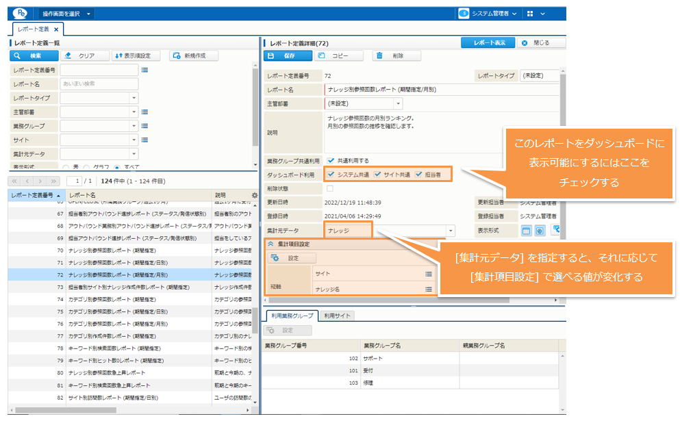 レポートで集計したい内容を定義する画面です。事前定義済みのレポートの内容も確認できます。