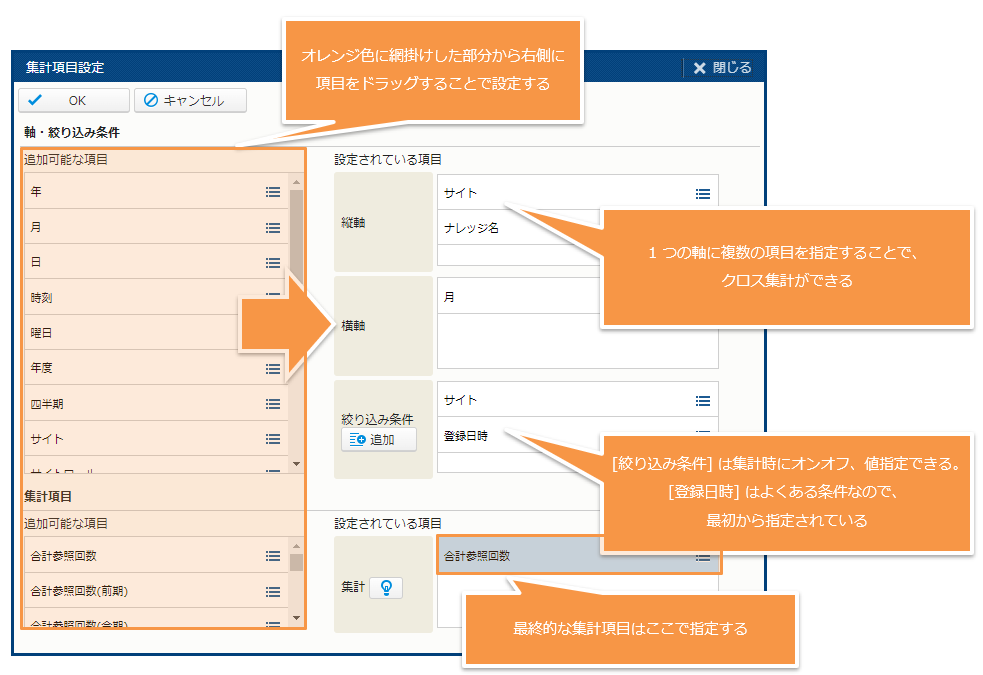 [設定] をクリックすると、[集計項目設定] サブウィンドウが表示されます。集計項目は、このサブウィンドウで設定します。[追加可能な項目] から [設定されている項目] に項目をドラッグすることで設定できます。