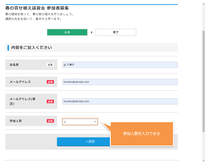 Web フォームのイメージを次に載せます。次の Web フォームの場合、履歴情報には、ユーザの "お名前"、"メールアドレス"、"参加人数" が含まれることになります。また、投稿日時などの投稿に付随する情報も含まれます。