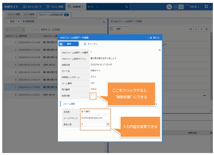 - 登録データがコールに保存される Web フォームの場合は、[コール管理] からも登録データの変更が可能です。その場合は、[コール管理] - [各種検索] - [Webフォーム投稿データ検索] から検索、編集してください。
