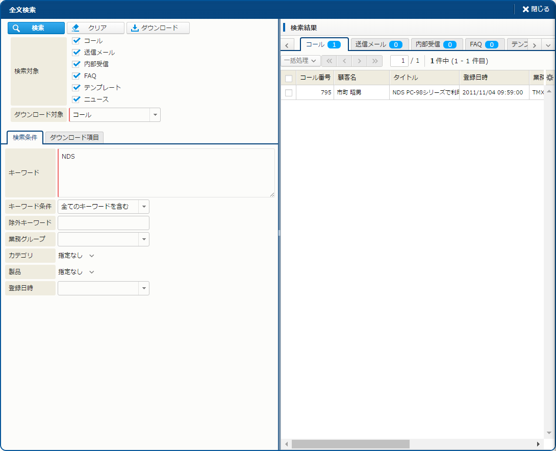 全文検索は、サイドメニューから [各種検索] - [全文検索] 画面から行います。次に、[全文検索] 画面の表示例を載せます。