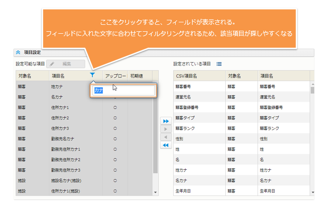 - 項目数が多いマスタ (コールや顧客) の CSV レイアウトを作成する場合は、"項目名フィルタリング" を利用することをお勧めします。使い方については、下の図を参照してください。