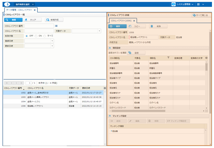 - 「データ管理 - CSVレイアウト - [CSVレイアウト] を登録・編集する - マッチング設定を行う」