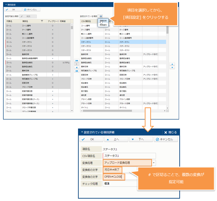 次に、上記で紹介したコールステータス1について、アップロード変換処理を指定した例を次に挙げます。