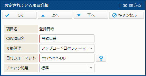 また、各項目について、CSVファイルに値がない場合の "初期値"、半角カナ ⇒ 全角カナ などの"変換処理"、電話番号チェックなどの "チェック処理" を設定することができます。