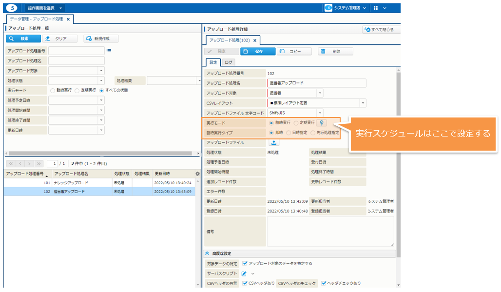 一括登録用に用意した CSV ファイルをアップロードする機能です。対象テーブル、エラー対応、処理予定時間などを設定します。処理結果も本画面で確認します。 アップロード処理の実行は、"即時" と "日時指定" のいずれかを選択することができます。 一括メンテナンス用に1回だけ実行する処理も、日次連携などで定期的に実行する処理も両方登録することができます。