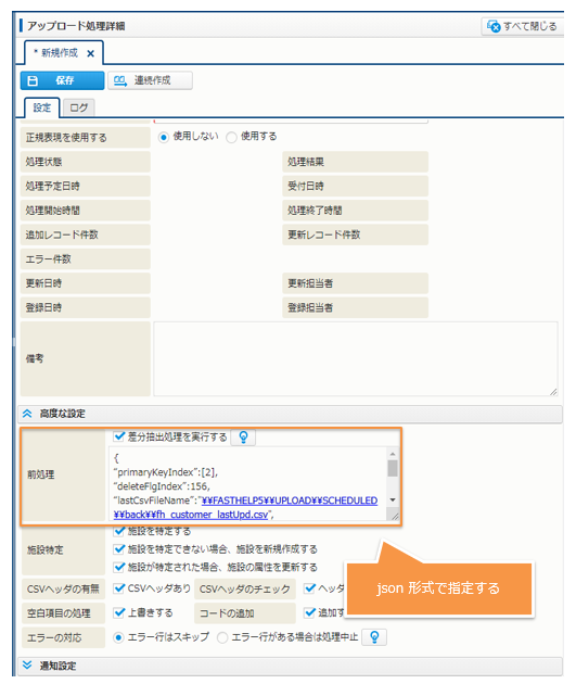 抽出時のキーとする項目等の情報は、[高度な設定] - [前処理] にテキストで指定します。形式は、json 形式です。