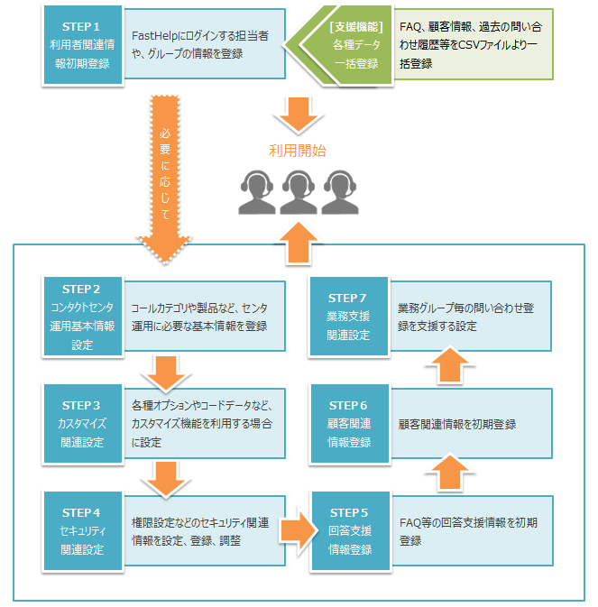 - 「■STEP1: 利用者関連情報初期登録」 で、ログインする担当者情報などの必須情報を登録すれば、FastHelp5 / FastAnswer2 の利用を開始できます。