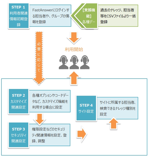 以下のステップの順で、各種設定を行うことで、スムーズな導入を行うことができます。