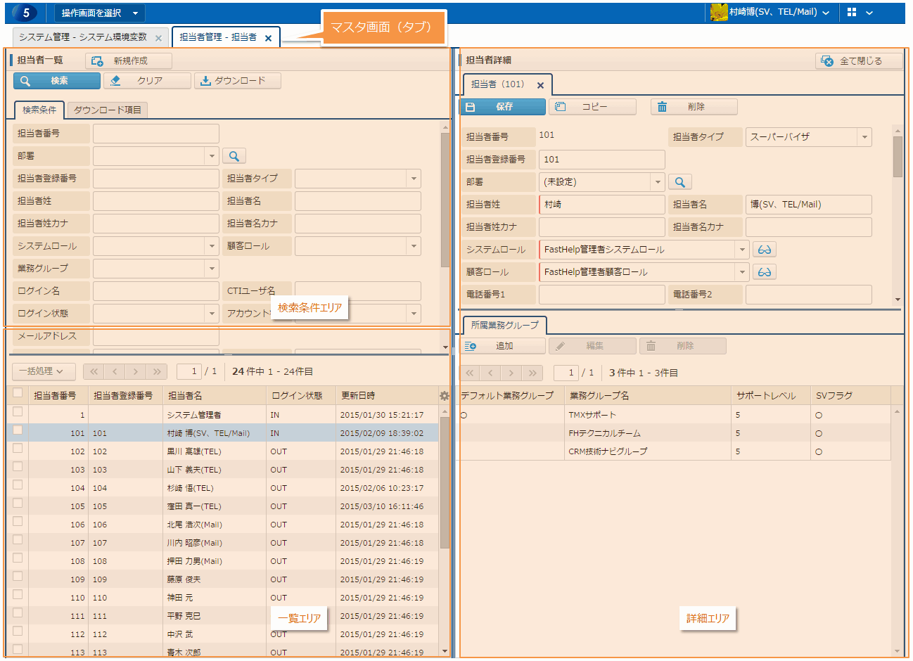 [検索条件] エリア、[一覧] エリア、[詳細] エリア に分かれます。