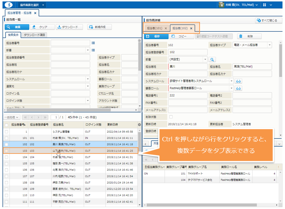 複数のマスタ画面を同時に開き、タブで切り替えながら操作することができます。