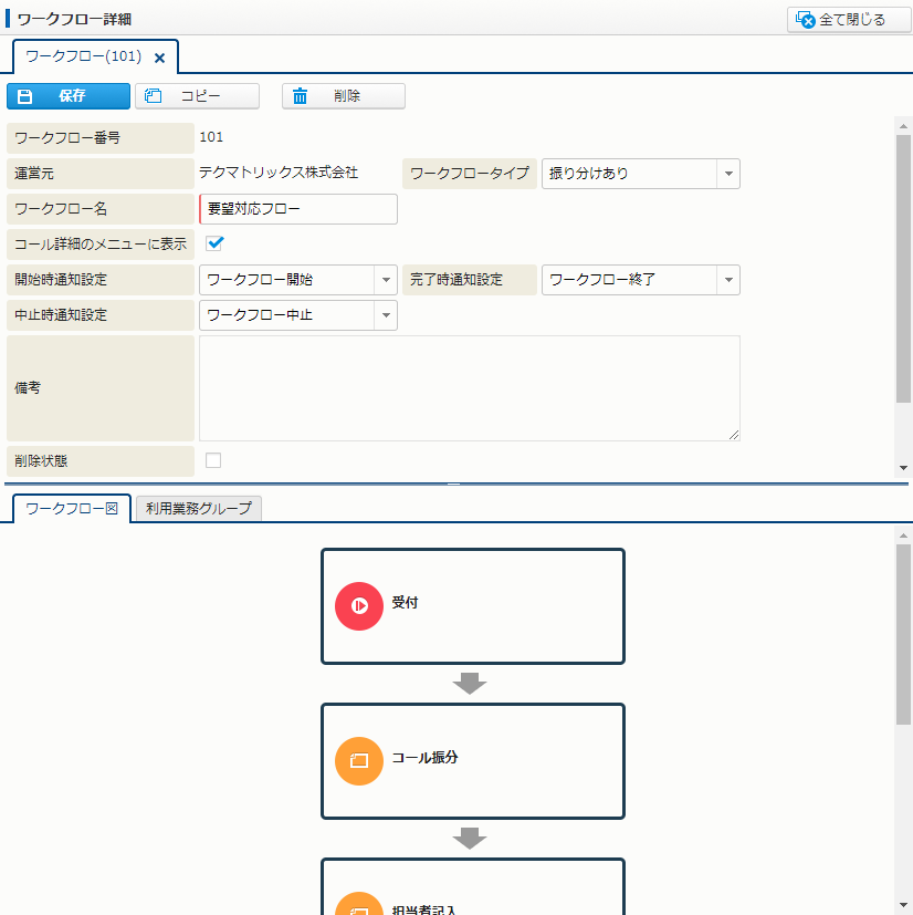 "ワークフロー" は、定型的な問い合わせ対応の流れ (フロー) を定義したマスタです。ワークフローを利用することで、定型的で煩雑なエスカレーションを簡単に処理することができます。