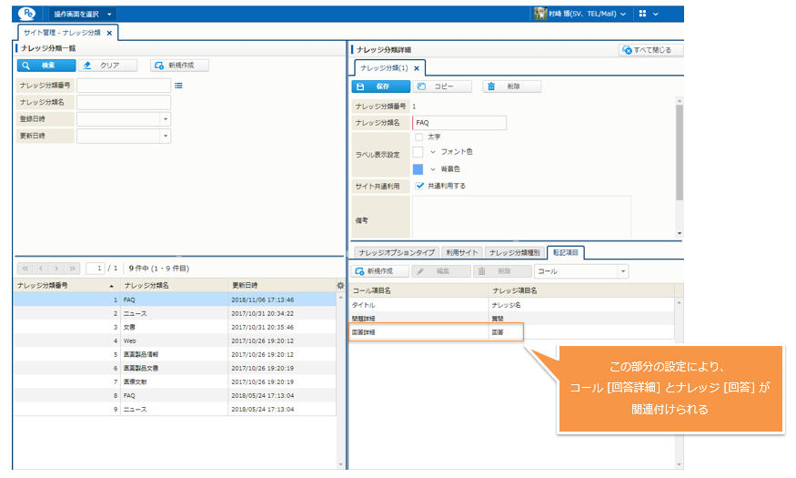ナレッジ分類には、初期設定として、"FAQ" や "文書" などが用意されています。担当者がナレッジを作成する時には、最初にナレッジ分類を選択します。ここで、たとえば "FAQ" を選ぶと "質問" と "回答" が含まれるナレッジ画面が、"文書" を選ぶとまた別のナレッジ画面が開きます。これにより、担当者はナレッジの内容に合ったナレッジ画面を最初から開くことができます。