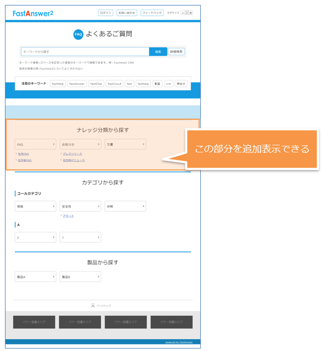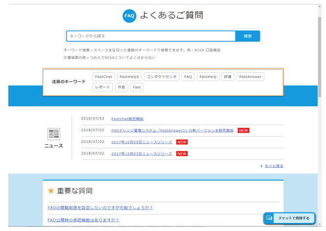 外部ページでは、ユーザがよく検索するキーワードが "注目のキーワード" として自動表示されます。これに加えて、[注目のキーワード] マスタを利用すると、注目のキーワードとして表示されるキーワードを管理者が事前に指定することができます。