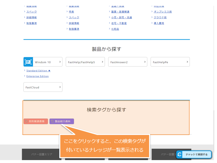 外部ページレイアウト設定。 外部ページのトップページで "〇〇から探す" 項目を表示するかどうかを、ナレッジ分類、カテゴリ、製品 ごとに指定できます。"ナレッジ分類から探す" は初期値では非表示になっていますが、knowledgeKindList の useFlg の値を true にすると、外部ページのトップページに表示されるようになります。[サイト詳細] - [利用ナレッジ分類] タブからアイコンの設定も可能。