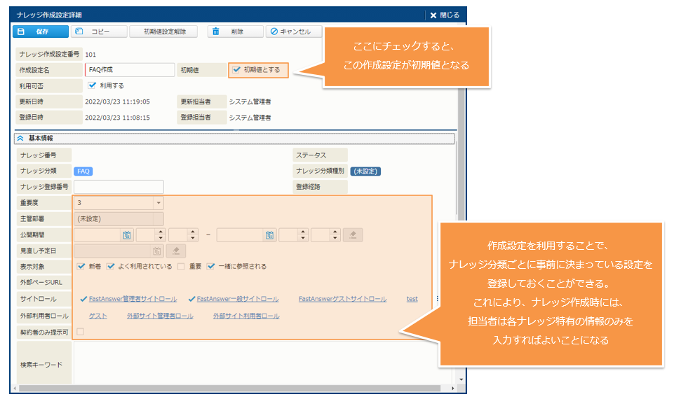 ナレッジ作成設定は、ナレッジ内の項目の初期値を事前に作成しておく機能です。ナレッジを登録する担当者の入力の手間を軽減することができます。