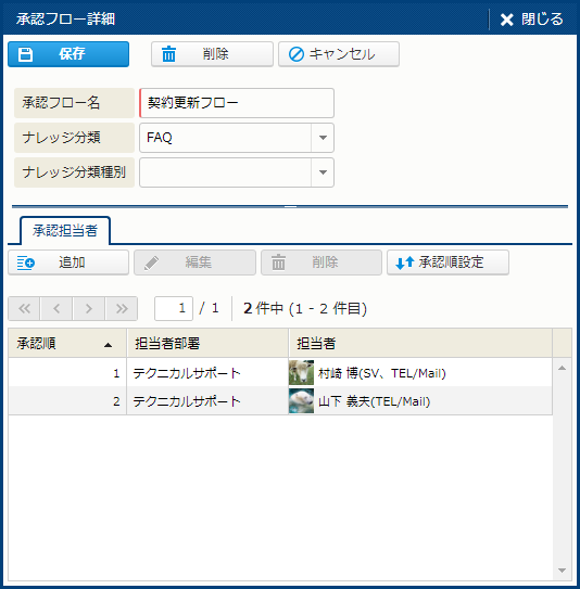 承認フローは、ナレッジ公開に関して他の担当者の承認を受ける時に利用する機能です。承認する担当者、順番をフローとして事前に管理者が決めることができます。