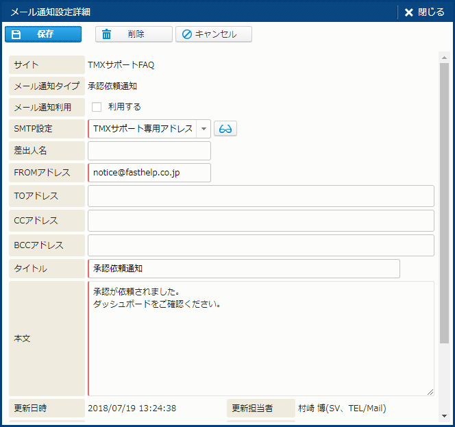 承認依頼、承認完了、承認却下された時に、担当者に通知メールを送信する機能です。