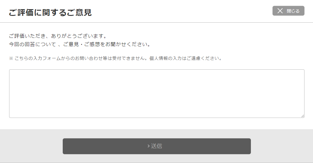 "ナレッジに関するアンケート" 表示のあとに、次のイメージのようなフォームを表示して、追加コメントを集めることができます。このフォームは、サイト環境変数 KNOWLEDGE_EVAL_WITH_COMMENT_FLG を利用すると表示させることができます。