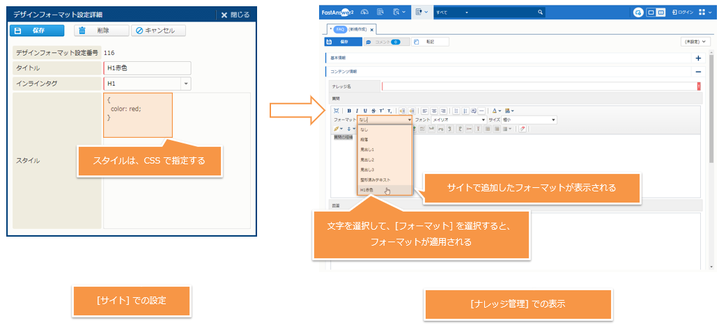 コンテンツ情報の一部の項目には、HTML タグを使ってフォーマット (表示形式) を付けることができます。[デザインフォーマット設定] では、HTML タグのデザインを CSS でカスタマイズできます。