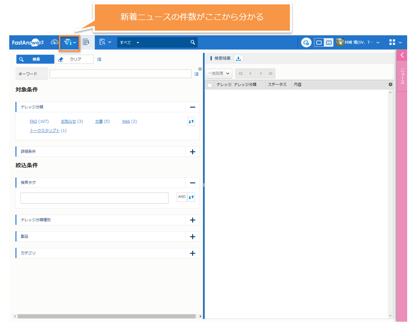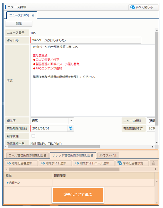 ナレッジ管理にログインしている担当者にニュースを配信することができます。複数の担当者に素早く情報を伝えることができます。
