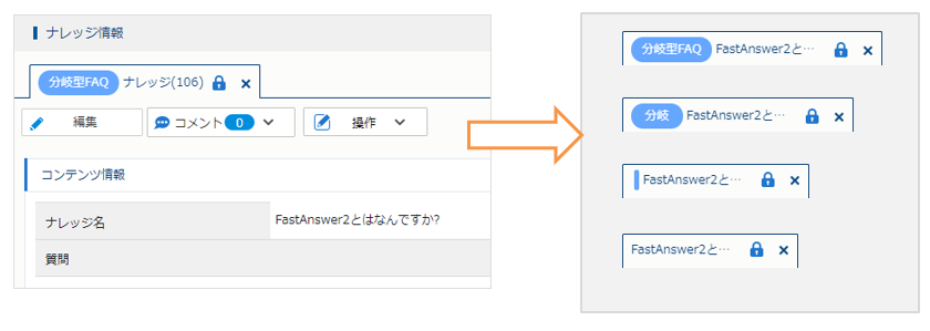 環境変数 KNOWLEDGE_TAB_KIND_FORMAT による、ナレッジ詳細 (情報) タブの見た目の違いについては、次のイメージを参照してください。