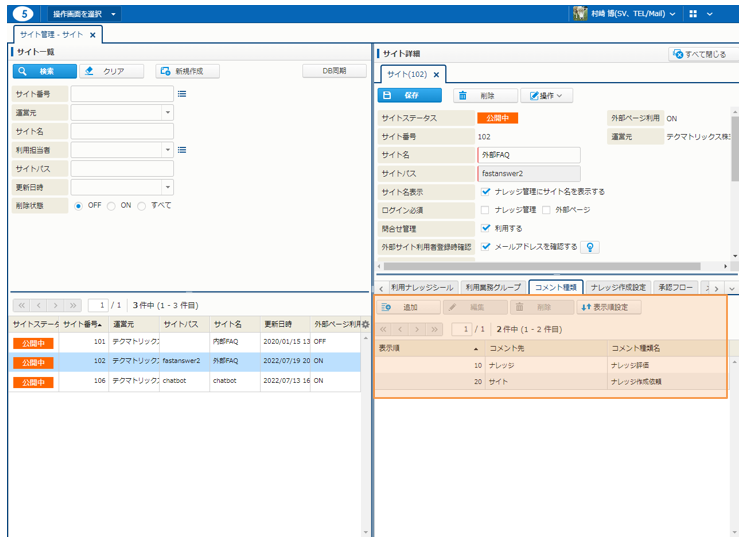 サイトを作成するには、[マスタ管理] - [サイト管理] - [サイト] で [新規作成] をクリックします。