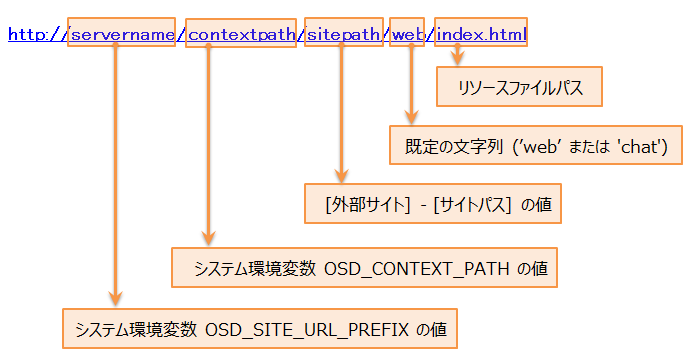 外部ページの URL は、複数の設定値を組み合わせた文字列です。各設定値が URL 内のどの部分に対応するかについて説明します。