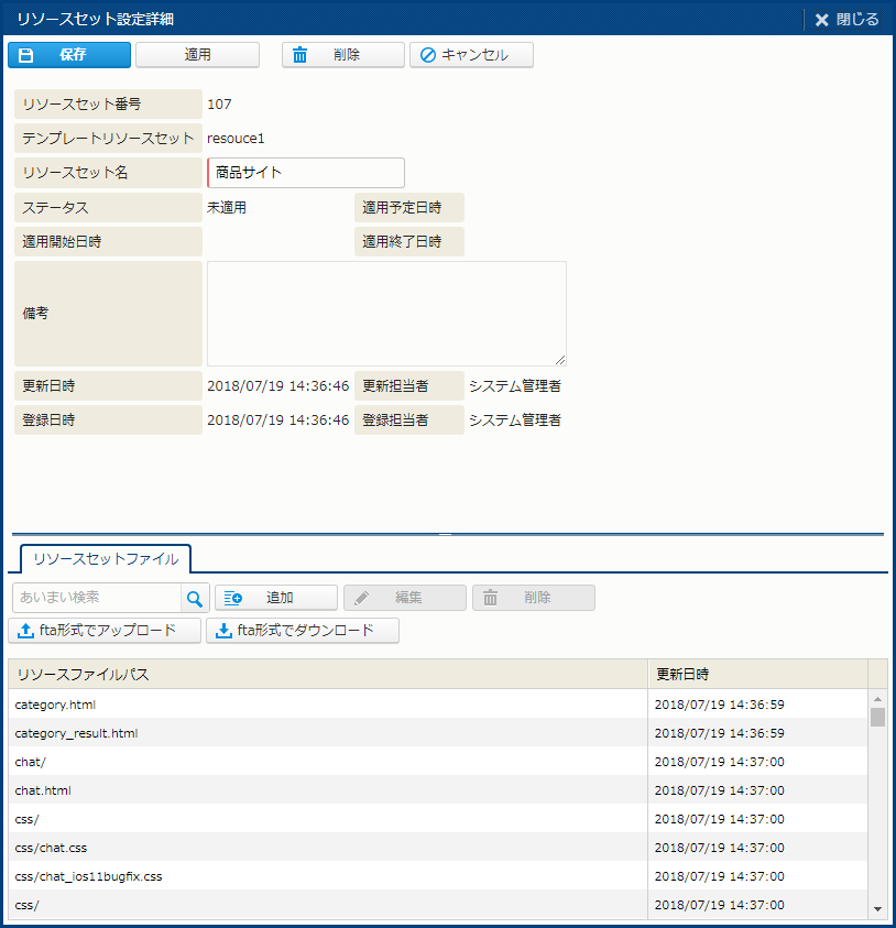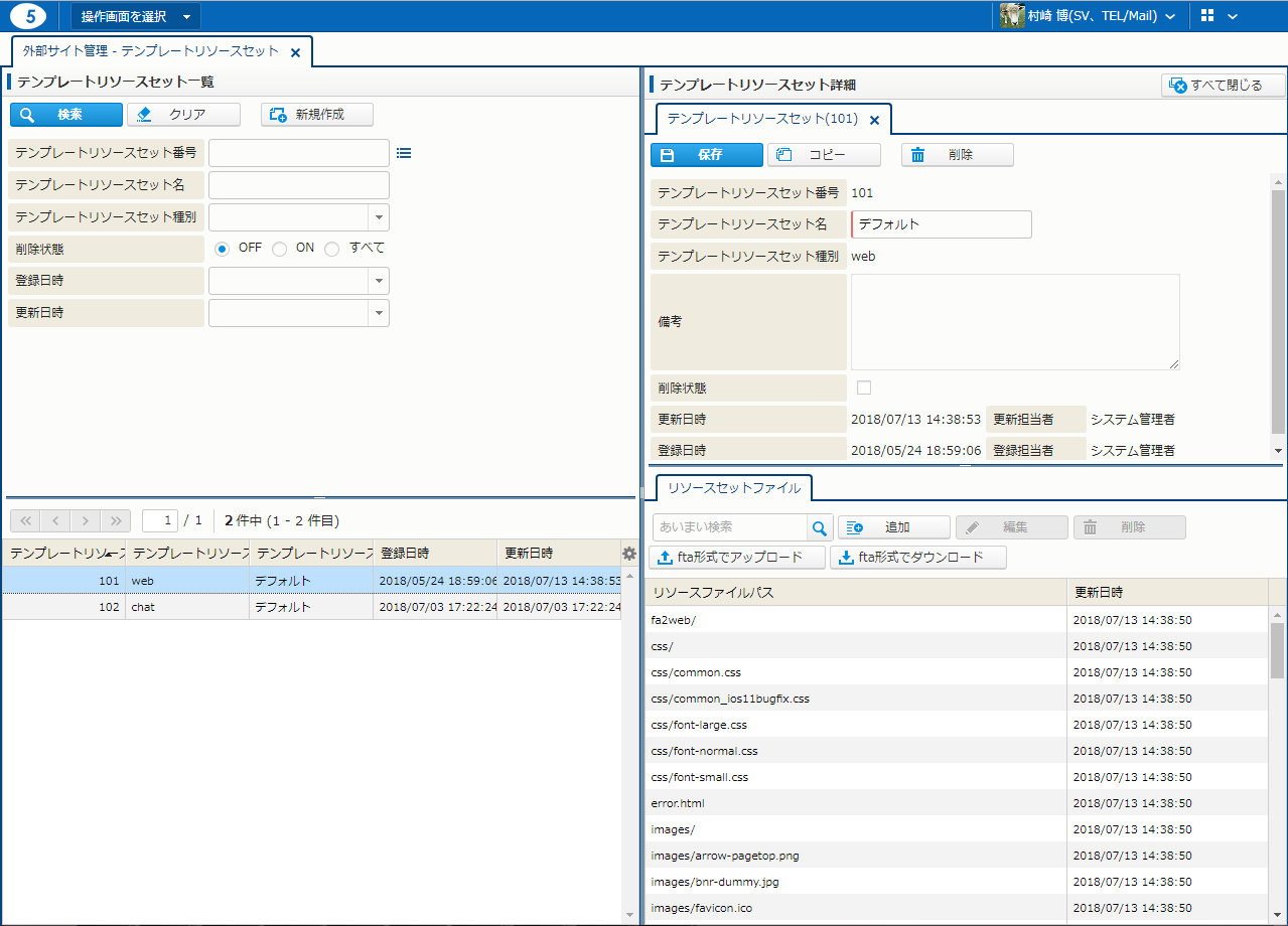 外部ページを構成するテンプレート HTML ファイル、CSS ファイル、画像ファイルの "まとまり" を指します。リソースセットを変更すると、外部ページのデザインを変更することができます。