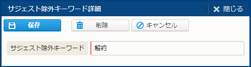 FastAnswer2 には、ユーザが検索条件を入力している途中でキーワード候補を自動的に表示する "サジェスト機能" があります。[サジェスト除外キーワード設定] では、"解約" などのネガティブなキーワードをサジェスト対象から除外することができます。