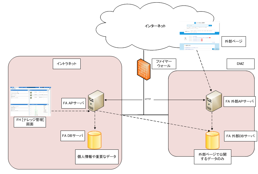 次に、外部ページを利用するサイトのシステム構成図を載せます。セキュリティを考慮し、DMZ に置く外部 DB サーバには、外部ページで公開するデータのみが格納されます。