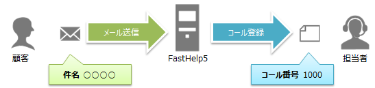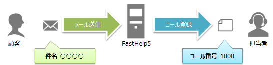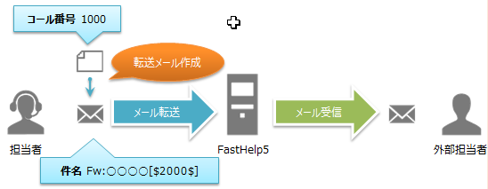 担当者コールの回答支援のために、外部担当者などに転送メールを作成し送信します。 この時、メールの件名には "オリジナルの件名+[$送信番号$]" のように、送信番号を付加します。 顧客からのメールを受信します。コール番号が発番され自動的にコールとして登録されます。